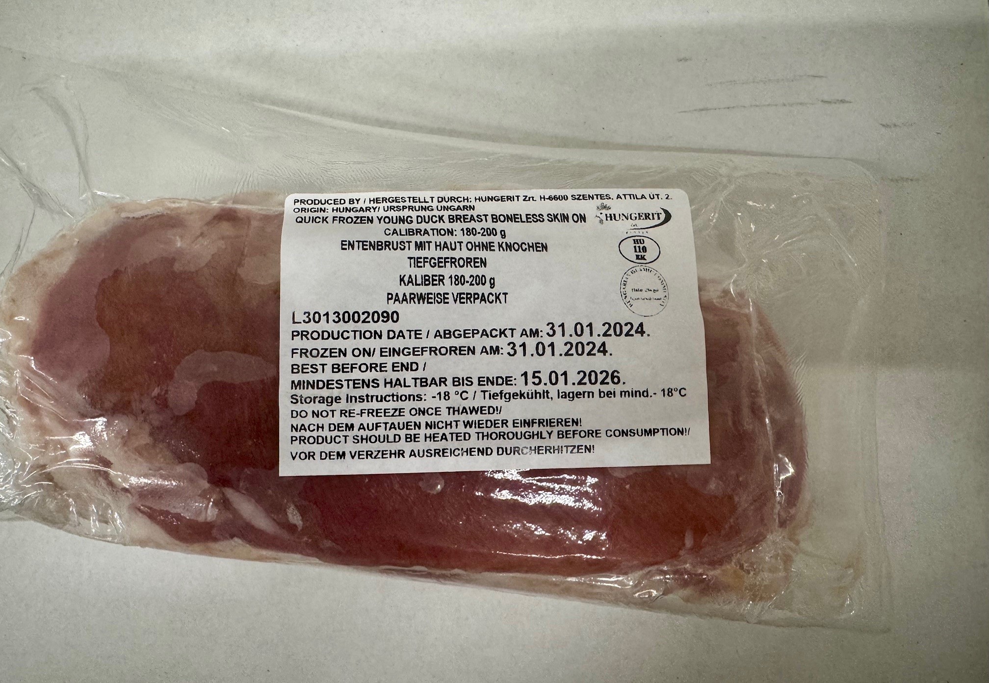 Külmutatud pardi rinnafilee nahaga, vaakumis 2 tk, tüki suurus umbes 190g